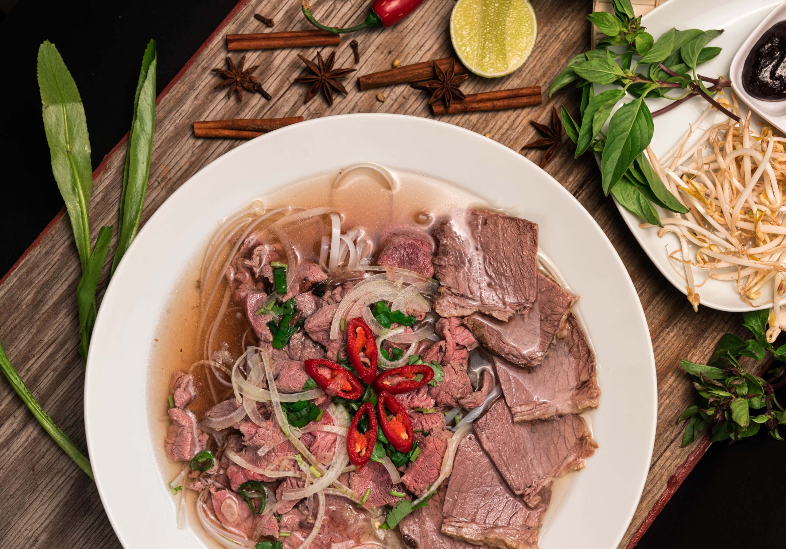 Aromatic broth, rice noodles, fresh herbs, and bean sprouts.