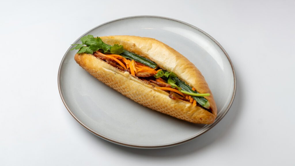 A pâté (meat option) and mayo baguette with pickled carrot and herbs.
